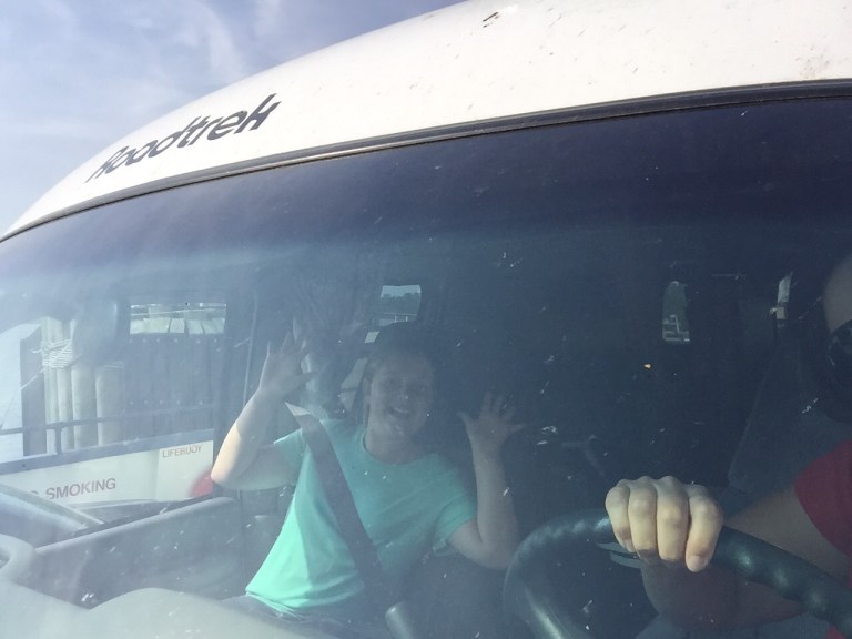 We were on the ferry the next day headed to Colonial Williamsburg, when this man came up to us, interested in the camper, and told us that he would give us a driving tour of the town and find us some good parking. The man, named Guy, was kind of sketchy, but Mom, being polite, agreed with the man and we drove around Williamsburg together for about 25 minutes and found parking. He had a small camper van that he had converted into a dog kennel on wheels. He took all the seats out and all the windows were open and his six dogs were all barking as we drove down the street. We were in a dog parade! We said goodbye to Guy and hurried off in the opposite direction as fast as possible. Colonial Williamsburg was really interesting and we got to do everything from tasting the ginger bread of the time to touring the jail/ jail keeper’s house.