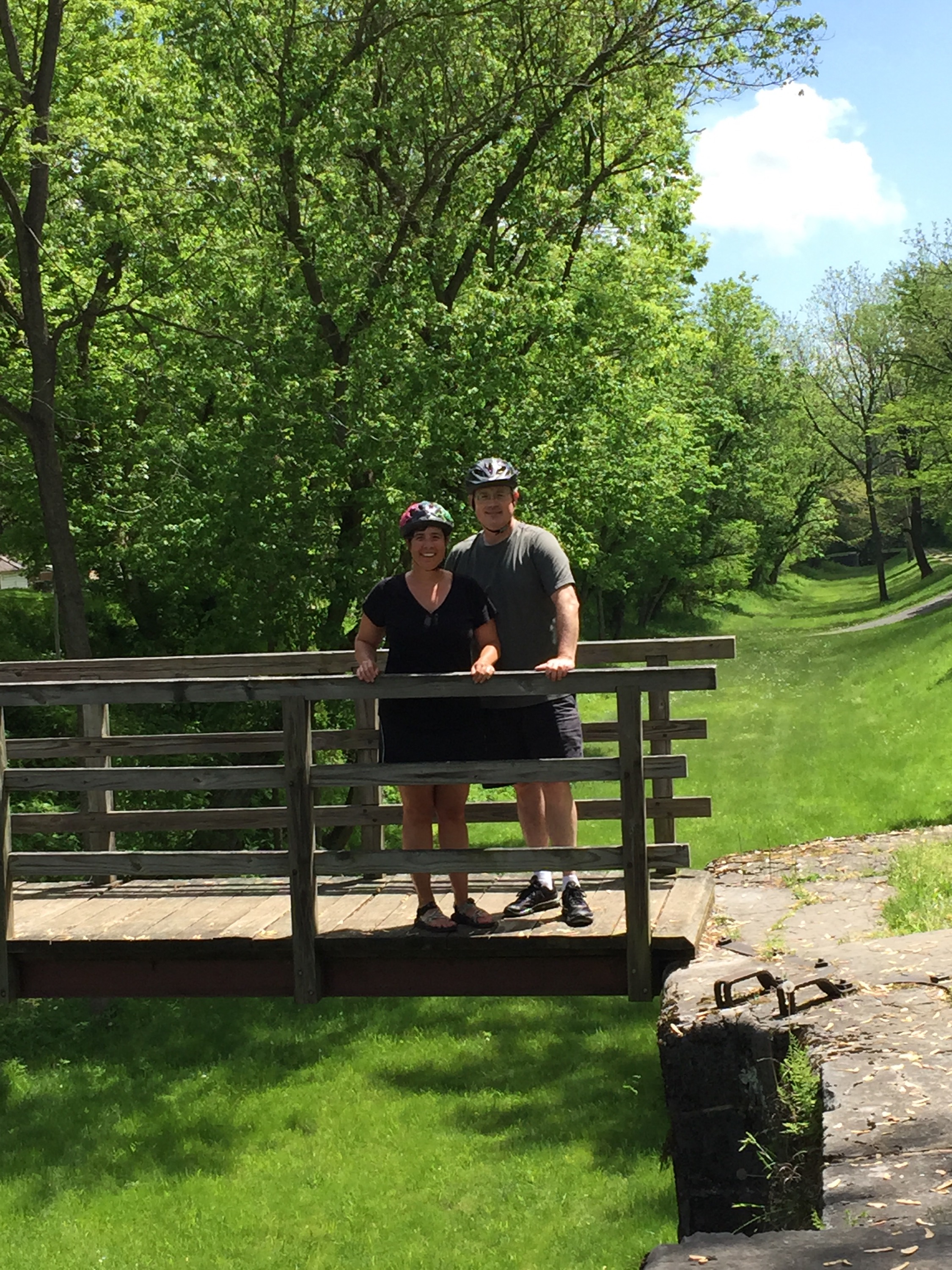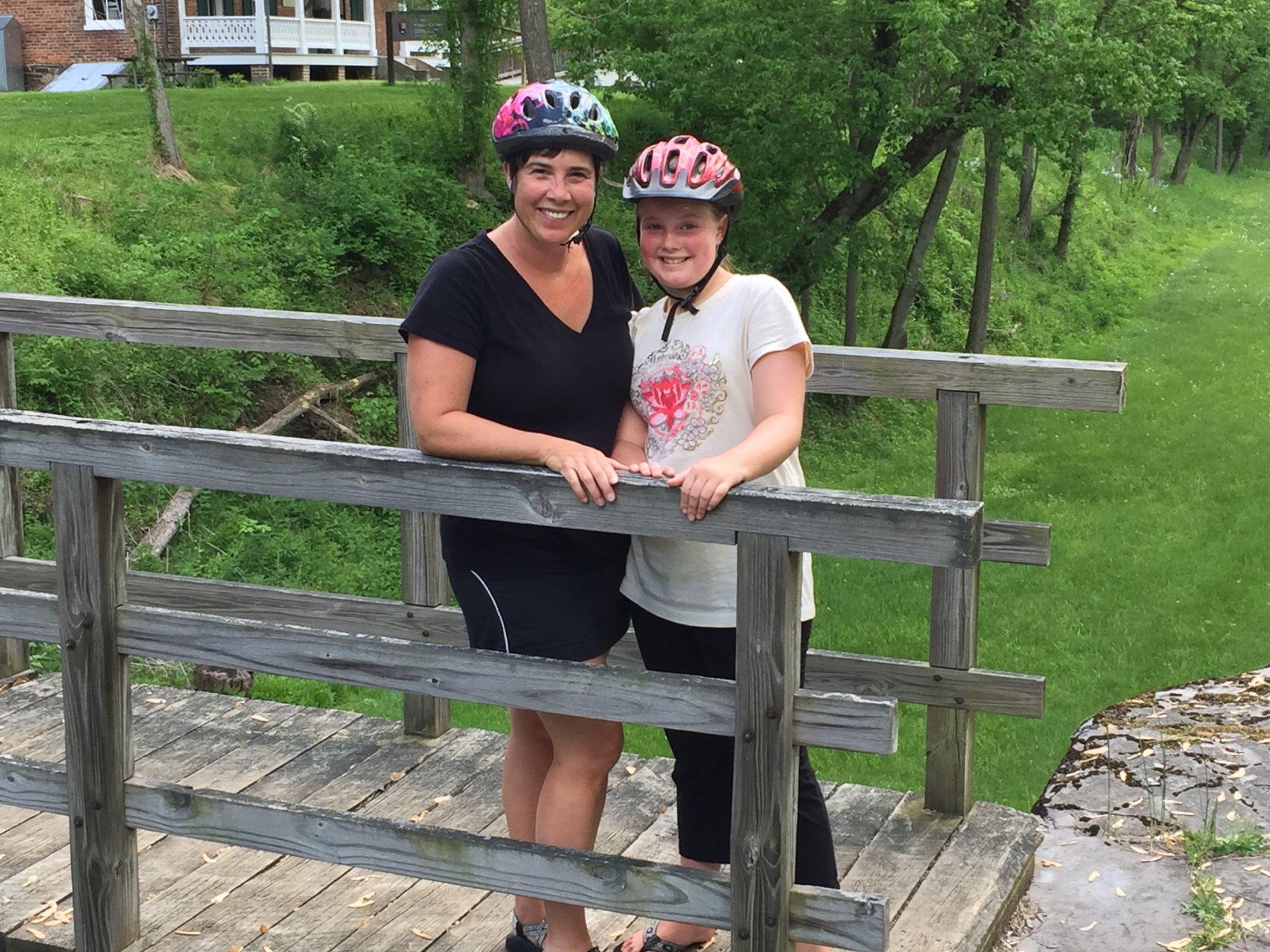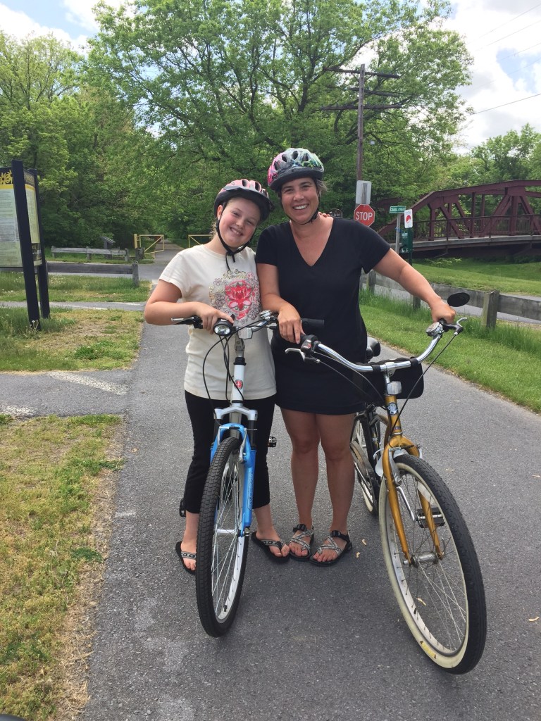 Next, we got ready to go bike on the C&O canal trail across the street from Grandma and Granddaddy’s B & B, (The 1828 Trail Inn). The inn is next to a paved trail that also has a dirt tow-path on the other side of the canal to ride bikes or hike. It’s called the Western Maryland Rail Trail and their Inn is smack dab in the middle of the 22 mile paved stretch. Their stretch is part of a continuous 400 mile, traffic free bicycling and walking trail system connecting downtown Pittsburgh, PA and ends in downtown Washington DC!